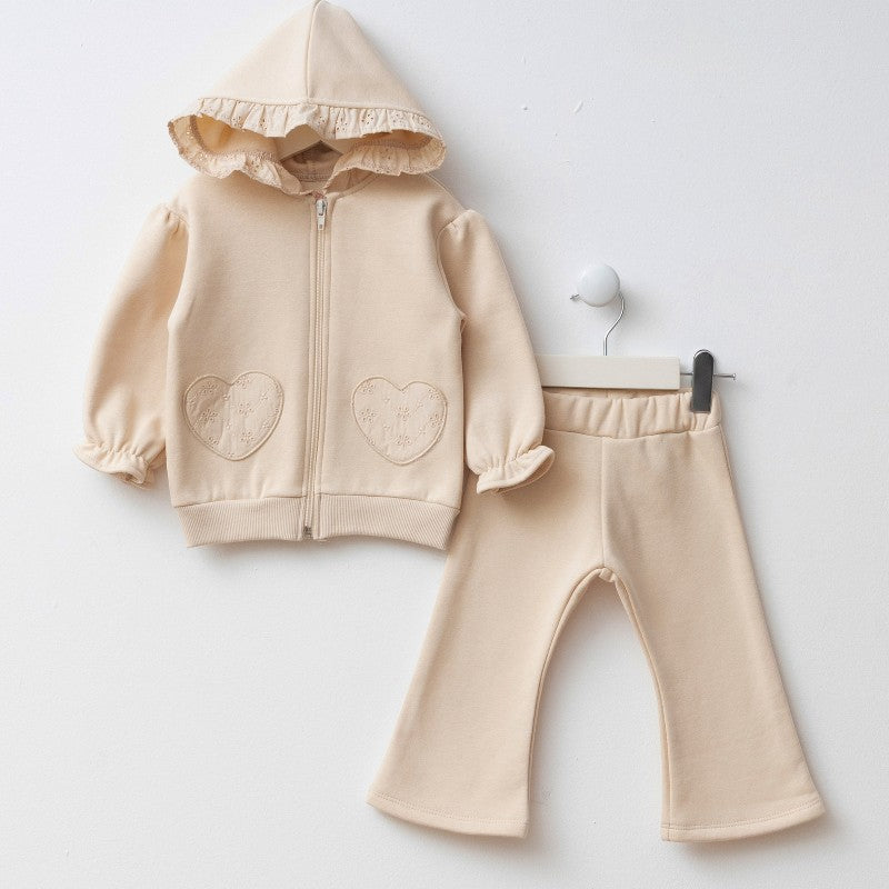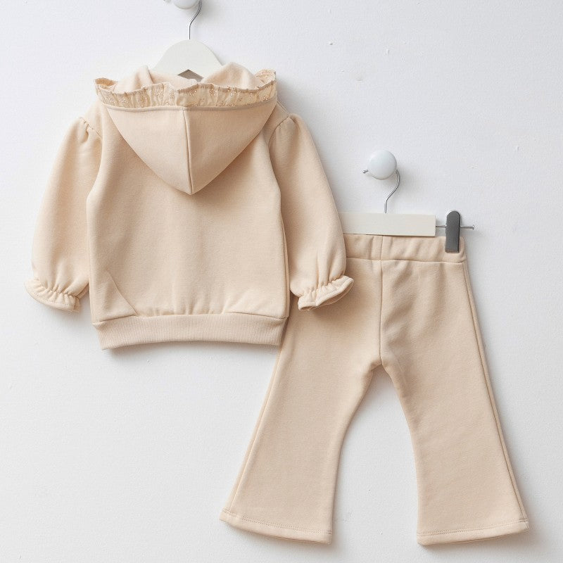 Мек и удобен комплект, изработен от висококачествен плат, подходящ за ежедневие и игри. Суичърът е украсен с фини дантелени детайли и има ластици на ръкавите, които придават по-стилна и подредена визия. Панталонките са съобразени с активното движение на малките деца.