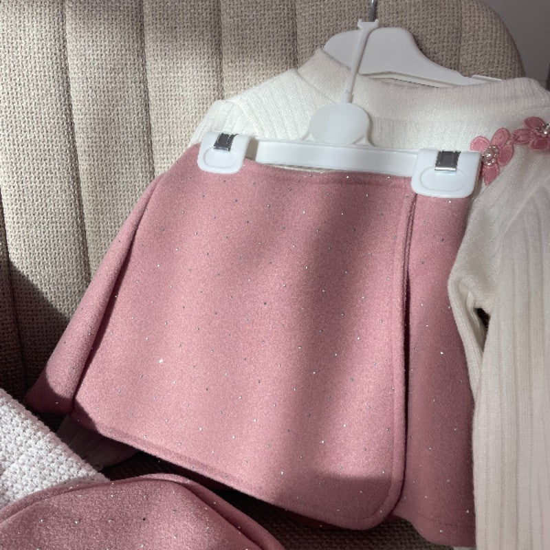 Стилен и практичен комплект за по-хладния сезон, съчетаващ комфорт и празнична визия. Панталонките са удобни и изработени от качествена материя, а шапката е декорирана с фини камъчета за допълнителен блясък.