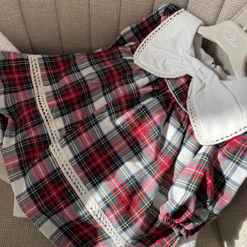 Впечатляваща рокля в червено-зелено каре, украсена с голяма бяла панделка и дантелени акценти. Меката материя осигурява комфорт, а класическият дизайн я прави перфектна за коледни фотосесии и празнични дни.