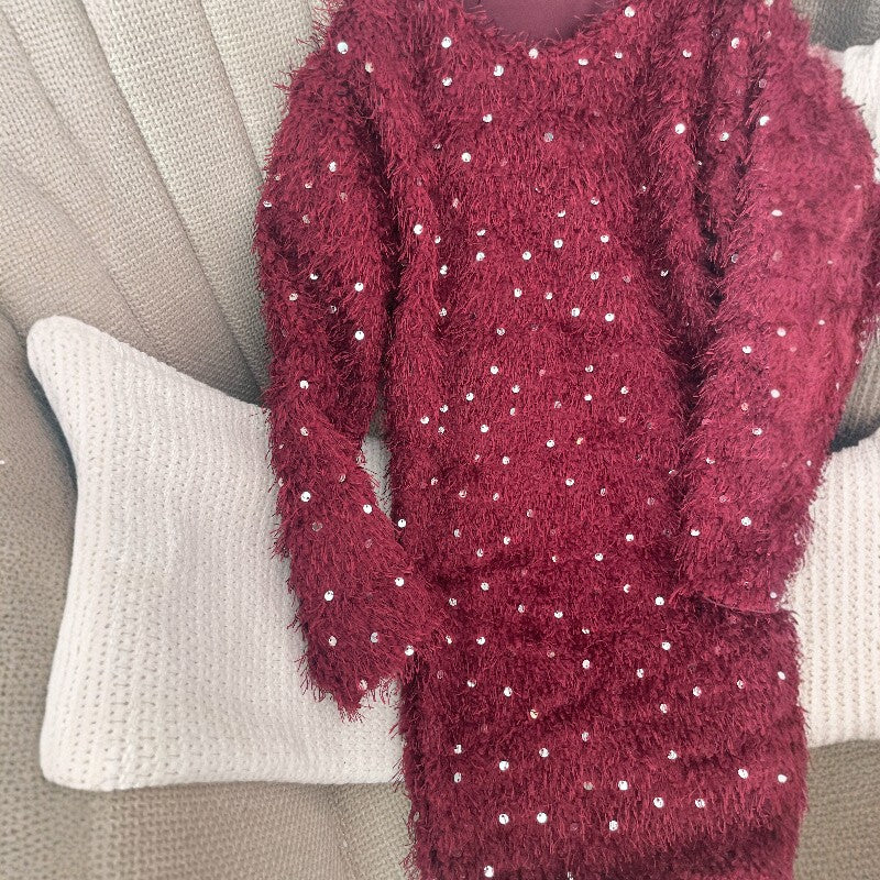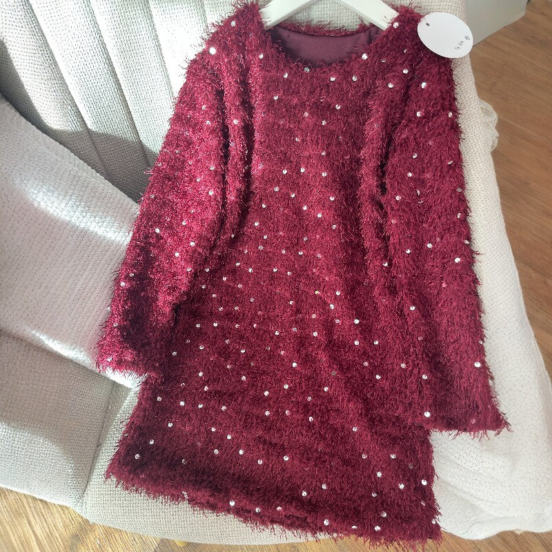 Подарете истински празничен блясък с тази впечатляваща детска рокля в елегантен бордо цвят. Изработена е от красиви, плътно подредени пайети, които улавят светлината от всеки ъгъл. Дизайнът е допълнен от фина пухкава текстура („косъмчета“) по материята, която придава обем, мекота и луксозно излъчване.