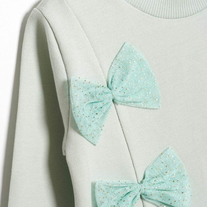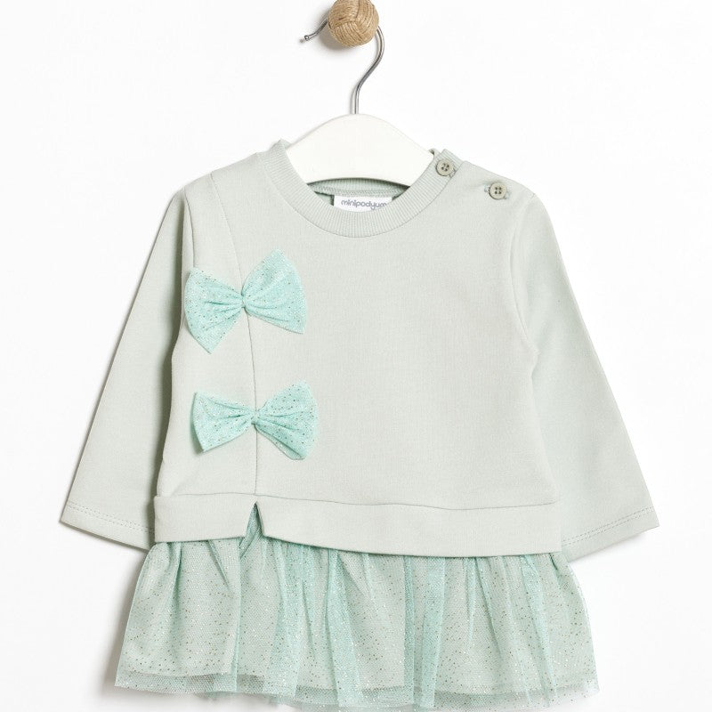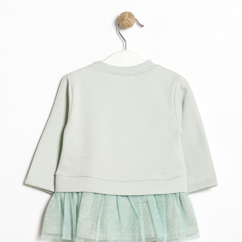Очарователна дълга блуза в стил туника, подходяща за носене с клинче или с чорапогащник. Моделът съчетава спортна удобна кройка със закопчаване с две копчета отгоре и елегантни акценти от тюл със сребърни частици. Две красиви панделки от същия тюлен плат придават завършен и празничен вид.