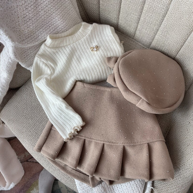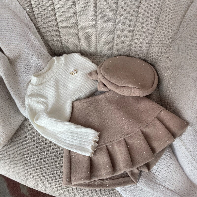Стилен и практичен комплект за по-хладния сезон, съчетаващ комфорт и празнична визия. Панталонките са удобни и изработени от качествена материя, а шапката е декорирана с фини камъчета за допълнителен блясък.