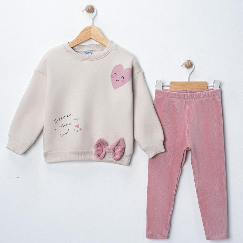 Спортен комплект с ватирана блуза  – идеален избор за ежедневие, разходки и игри. Изработен от мек и приятен на допир плат, който не дразни кожата и осигурява комфорт през целия ден. Ватираната блуза е с нежен акцент – декоративна панделка, която добавя сладка и стилна нотка. Долнището е удобно, леко и еластично, подходящо за активност и свобода на движение.