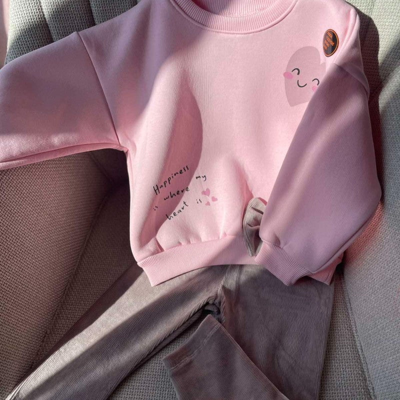 Спортен комплект с ватирана блуза – идеален избор за ежедневие, разходки и игри. Изработен от мек и приятен на допир плат, който не дразни кожата и осигурява комфорт през целия ден. Ватираната блуза е с нежен акцент – декоративна панделка, която добавя сладка и стилна нотка. Долнището е удобно, леко и еластично, подходящо за активност и свобода на движение.