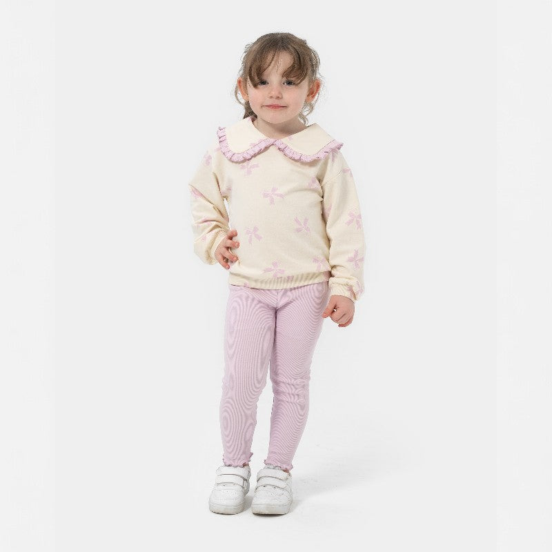Очарователен комплект, състоящ се от удобно клинче и блузка с интересна яка, украсена с нежни къдрици и панделки. Моделът е изработен с внимание към детайла, за да осигури комфорт и сладка визия на малките дами.