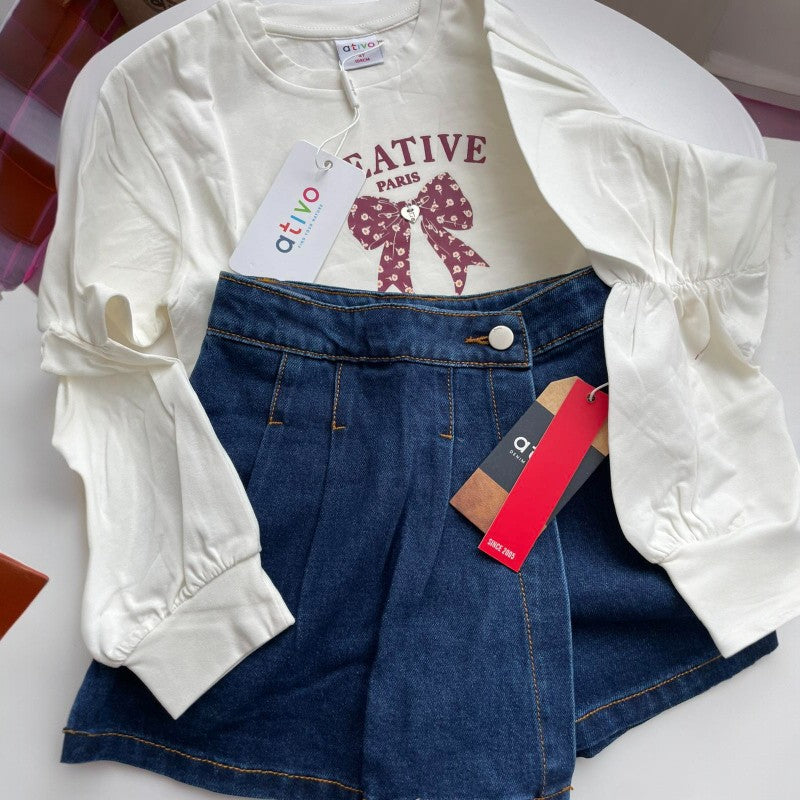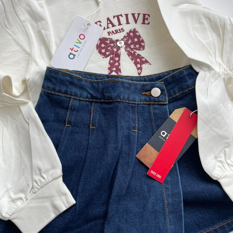 Комплект от 2 асти – дънкова пола-панталонки + бяла блуза