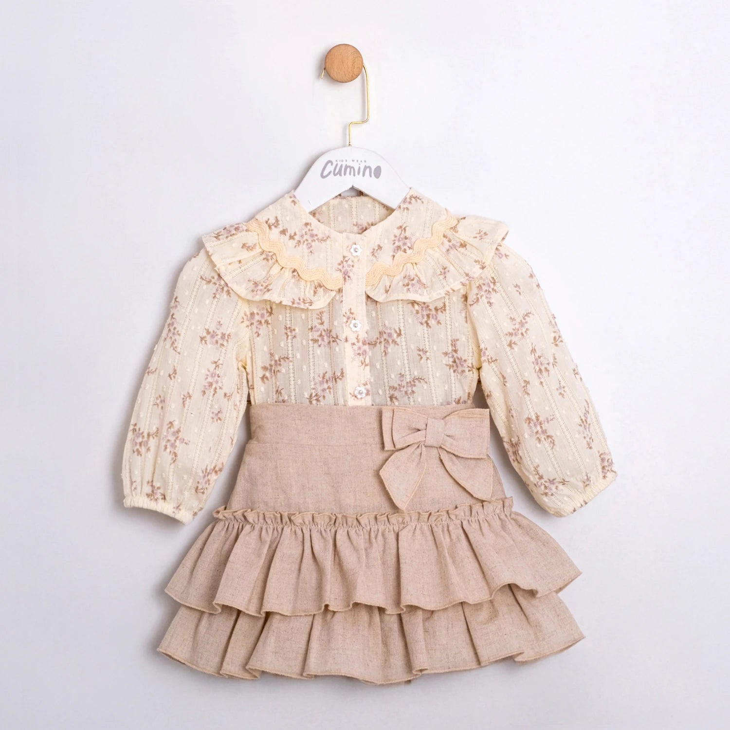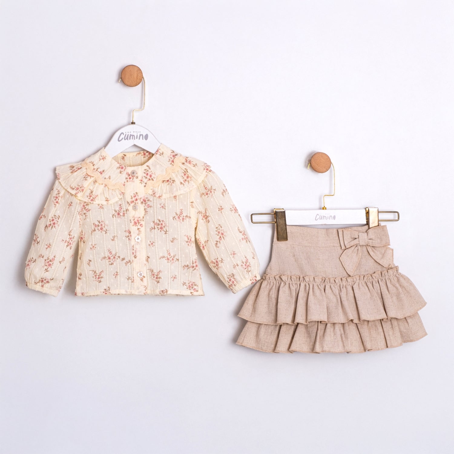 Нежен комплект за малки момичета, състоящ се от пола с панделка и риза с дантела на яката. Полата е удобна и стои красиво, а ризата добавя фин детайл с нежната дантела. Перфектен за празници или ежедневие.