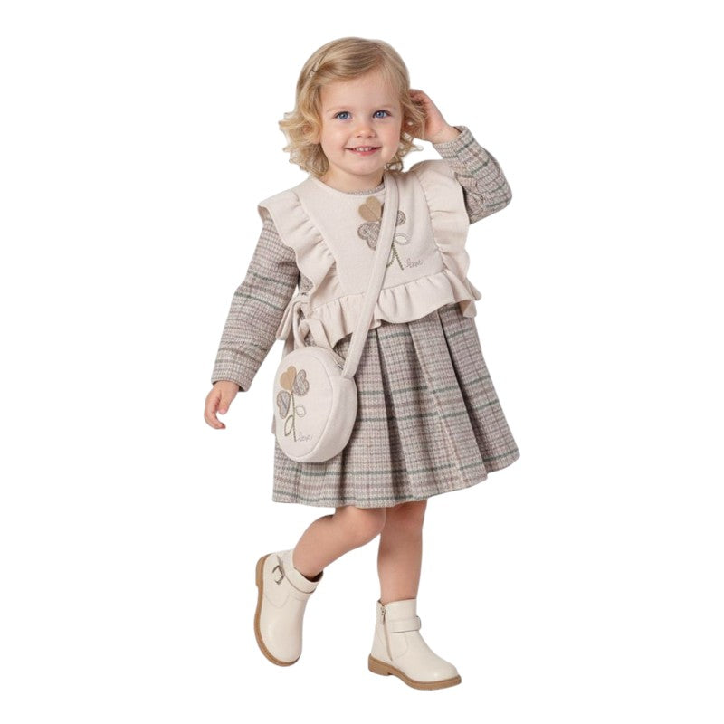 Очарователен комплект за малки дами, съчетаващ стил и удобство. Включва елегантна рокля на каре с дълъг ръкав, мек елек с къдрички и тематична чантичка в същия десен.