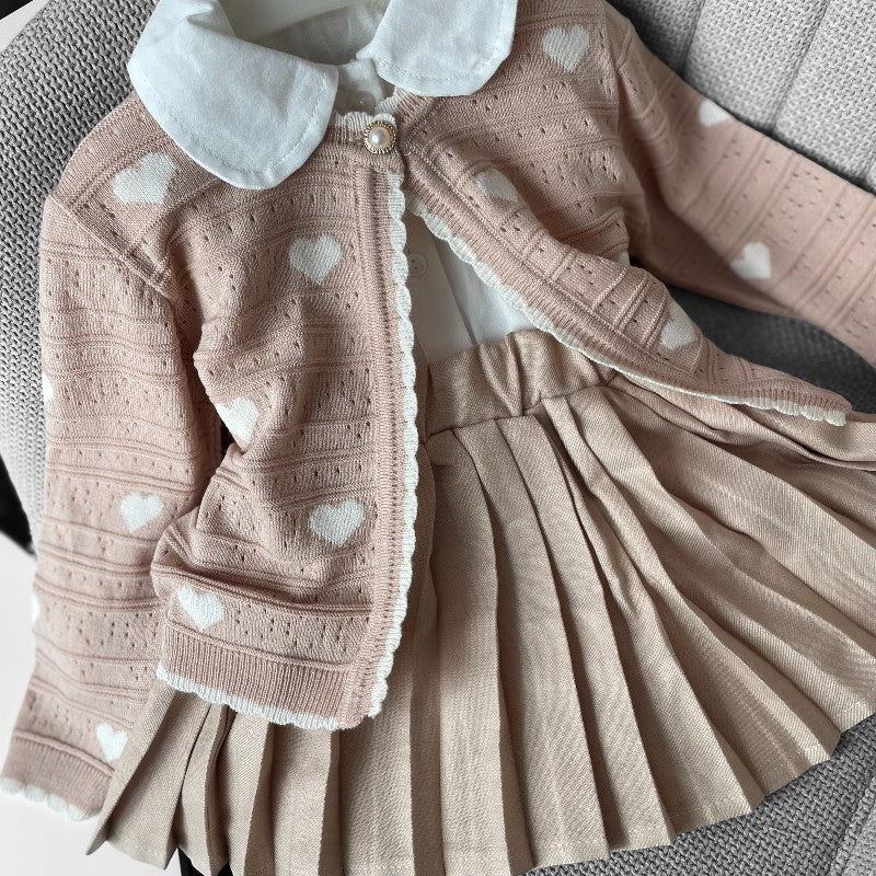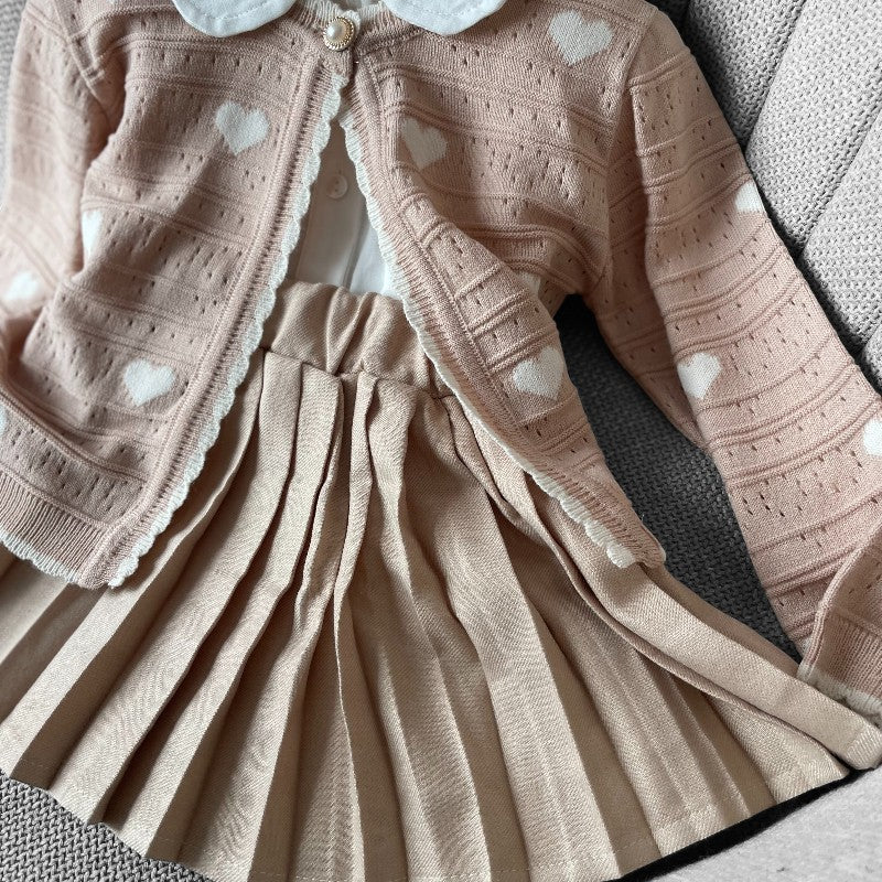 Изискан 3-частен комплект за деца от 2 до 5 години, съчетаващ комфорт и стил. Включва пола с ластик на талията за удобно носене, нежна риза с яка за елегантен завършек и жилетка на сърчица с едно копче в горната част, която придава стилна визия. Комплектът се предлага в два цвята – тъмен и по-светъл вариант, подходящ за празници, специални поводи или за малка доза ежедневен чар
