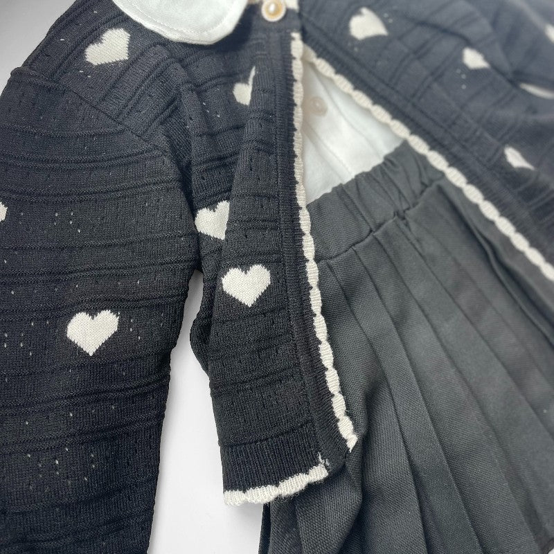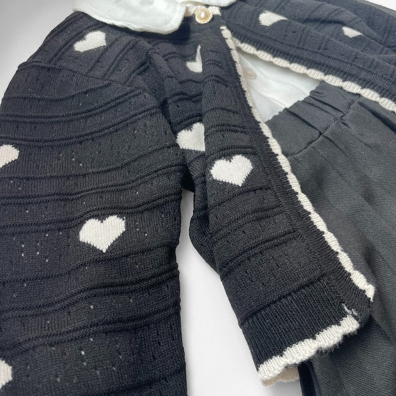 Изискан 3-частен комплект за деца от 2 до 5 години, съчетаващ комфорт и стил. Включва пола с ластик на талията за удобно носене, нежна риза с яка за елегантен завършек и жилетка на сърчица с едно копче в горната част, която придава стилна визия. Комплектът се предлага в два цвята – тъмен и по-светъл вариант, подходящ за празници, специални поводи или за малка доза ежедневен чар