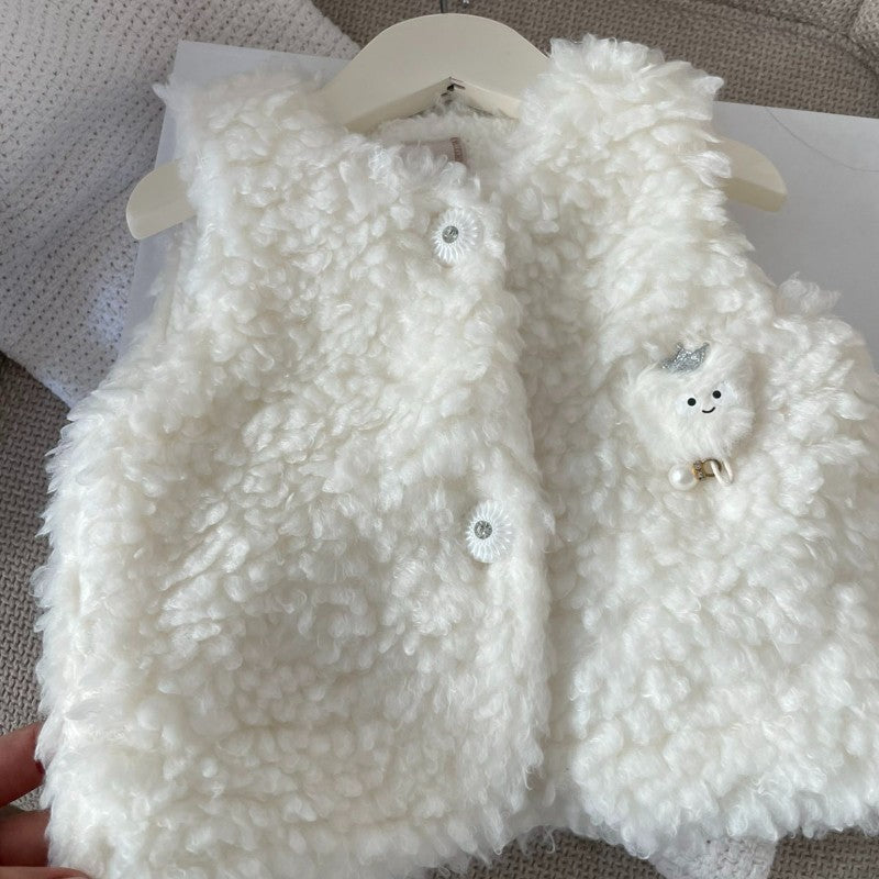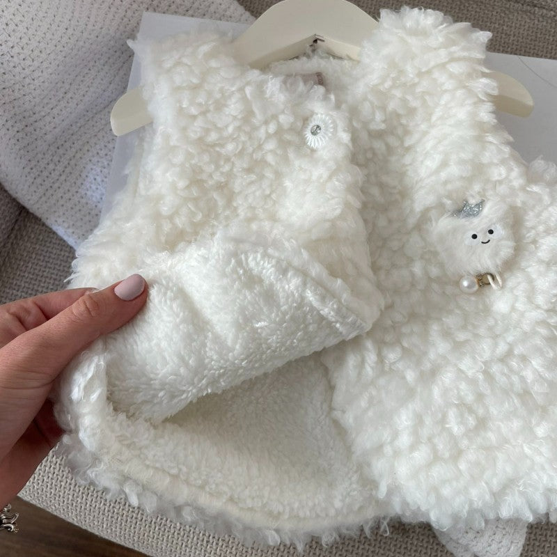 Нежно пухкаво елече, което ще те обгърне в топлина и комфорт. Изработено от мека материя, с фини копчета, придаващи изискан завършек.