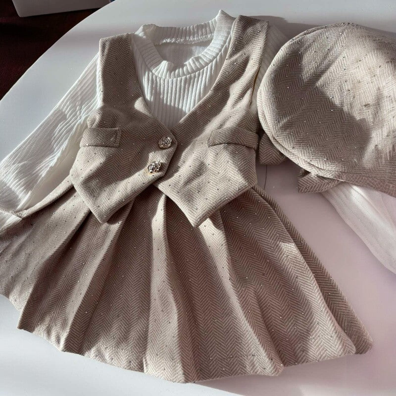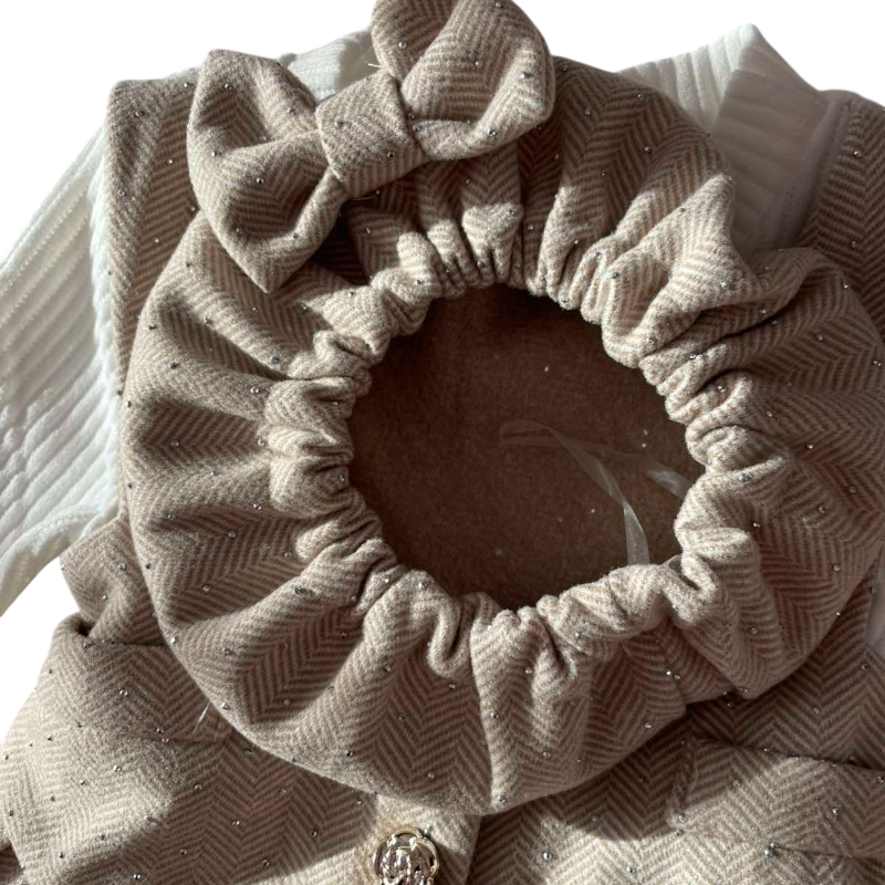 Очарователна детска рокличка с имитация на елегантно елече, изработена от мек и висококачествен плат в нежен бежов цвят. Моделът е украсен с фини сребърни камъчета, които придават деликатен блясък и стил. П Комплектът включва и стилна шапка от същия плат, създаваща завършен и изискан вид. Перфектен избор за специални поводи, фотосесии или празнични дни, когато искате малката дама да изглежда неповторимо.